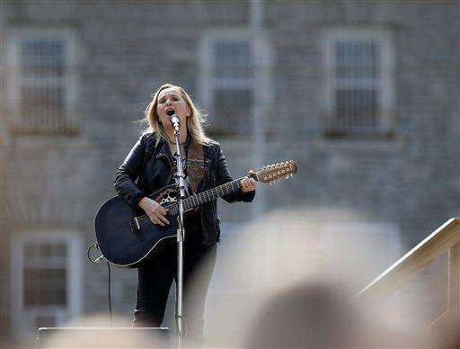 Melissa Etheridge performs for inmates at the Ohio Reformatory for Women in Marysville, Ohio, on Wednesday, Oct. 7, 2015. Etheridge says a video of female inmates singing one of her songs led to her performing with them. (Jonathan Quilter/Columbus Dispatch via AP)