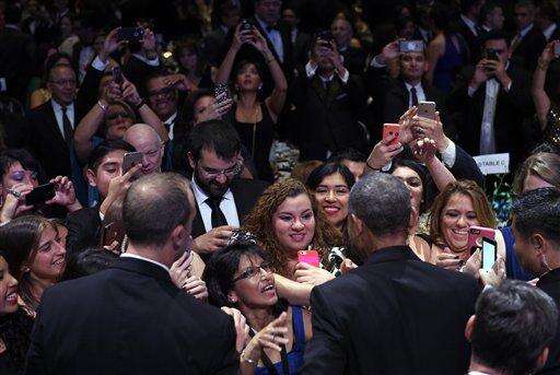 President Barack Obama greets the crowd after speaking at the Congressional Hispanic Caucus Institute's (CHCI) 38th Anniversary Awards Gala in Washington, Thursday, Oct. 8, 2015. The Awards Gala is the signature event in its Hispanic Heritage Month list of events that include the Public Policy Conference. (AP Photo/Susan Walsh)