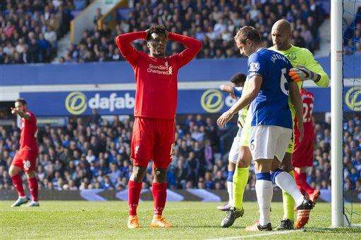 Liverpool's Daniel Sturridge, centre left, reacts after a missed opportunity during the English Premier League soccer match between Everton and Liverpool at Goodison Park Stadium, Liverpool, England, Sunday Oct. 4, 2015. (AP Photo/Jon Super) The Associated Press