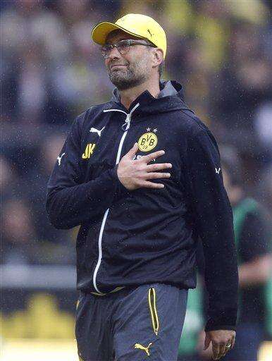 FILE - In this Saturday, May 23, 2015 file photo Dortmund's head coach Juergen Klopp says farewell to supporters after the German first division Bundesliga soccer match between BvB Borussia Dortmund and Werder Bremen in Dortmund, Germany. Juergen Klopp is headed to Liverpool to take over as manager of the Premier League club, a person familiar with the situation said Thursday Oct. 8, 2015. (AP Photo/Frank Augstein, File) The Associated Press