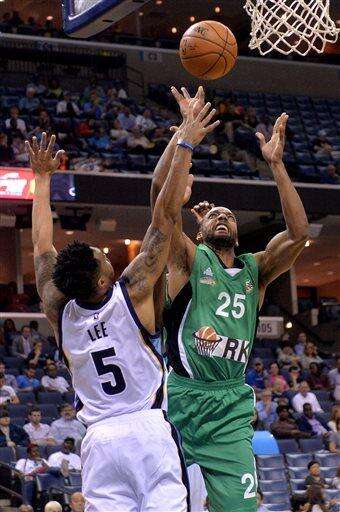 Maccabi Haifa forward Dijon Thompson (25) shoots against Memphis Grizzlies guard Courtney Lee (5) in the first half of an NBA basketball preseason game Thursday, Oct. 8, 2015, in Memphis, Tenn. (AP Photo/Brandon Dill)