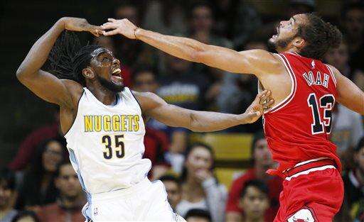 Denver Nuggets forward Kenneth Faried, left, fights for control of a rebound with Chicago Bulls center Joakim Noah in the first half of a preseason NBA basketball game Thursday, Oct. 8, 2015, in Boulder, Colo. (AP Photo/David Zalubowski)