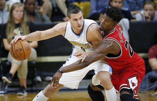 Denver Nuggets forward Danilo Gallinari, left, of Italy, protects the ball as Chicago Bulls guard Jimmy Butler reaches for a steal in the first half of an NBA preseason basketball game Thursday, Oct. 8, 2015, in Boulder, Colo. (AP Photo/David Zalubowski)