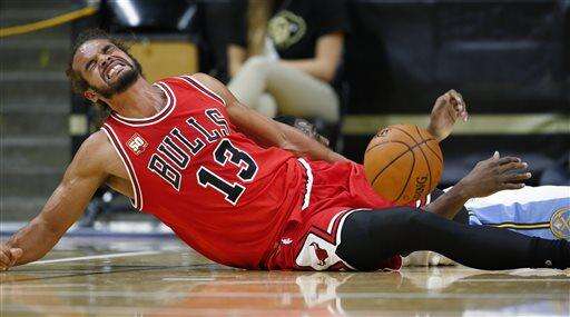 Chicago Bulls center Joakim Noah, front, grimaces as he falls on the floor while fighting for a rebound with Denver Nuggets forward Kenneth Faried in the first half of a preseason NBA basketball game Thursday, Oct. 8, 2015, in Boulder, Colo. (AP Photo/David Zalubowski)