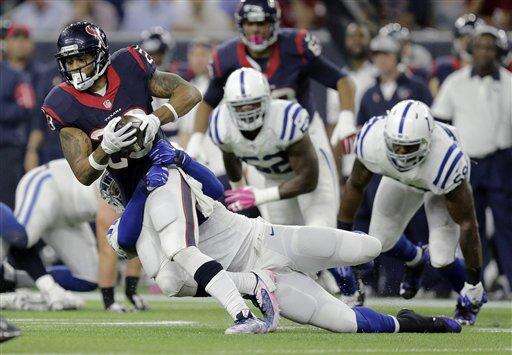 Houston Texans' Arian Foster (23) is stopped by Indianapolis Colts' Jonathan Newsome (91) during the first half of an NFL football game Thursday, Oct. 8, 2015, in Houston. (AP Photo/Patric Schneider)