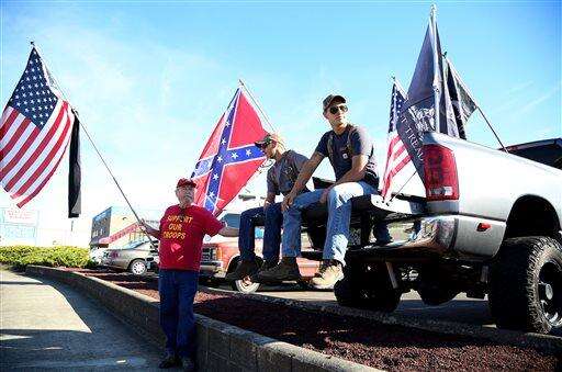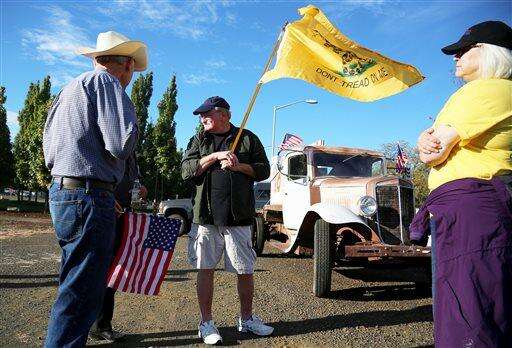 Demonstrators surrounded by multiple flags wait outside of Roseburg Regional Airport for President Barack Obama's arrival, Friday, Oct. 9, 2015, in Roseburg, Ore. Angry with Obama for calling for tighter gun restrictions in the wake of last week's deadly shootings at Umpqua Community College, gun-rights activists gathered to protest the president's visit to meet with victims' families. (AP Photo/Ryan Kang)