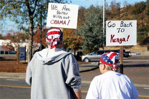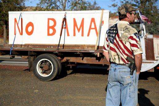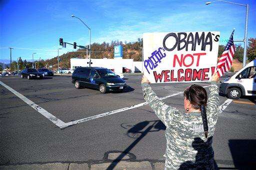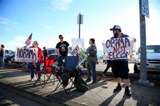 Demonstrators wait outside of Roseburg Regional Airport for President Barack Obama's arrival, Friday, Oct. 9, 2015, in Roseburg, Ore. Angry with Obama for calling for tighter gun restrictions in the wake of last week's deadly shootings at Umpqua Community College, gun-rights activists gathered to protest the president's visit to meet with victims' families. (AP Photo/Ryan Kang)