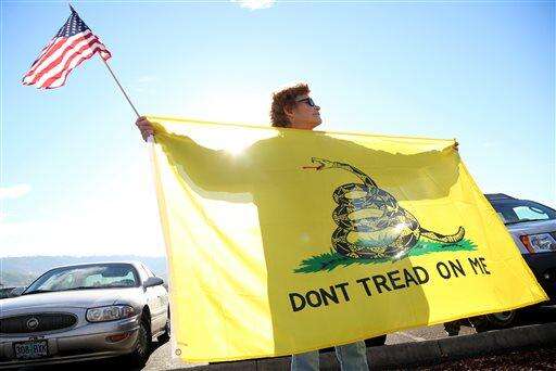 A man holds up the Gadsden flag as he waits outside of Roseburg Municipal Airport for President Barack Obama's arrival in Roseburg, Ore., Friday, Oct. 9, 2015. Gun-rights activists say they plan to protest when Obama visits here Friday to meet with families of victims of last week's college shooting rampage. They are angry about Obama's call for more gun restrictions after the killing of eight students and a teacher. (AP Photo/Ryan Kang)