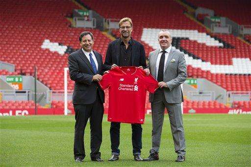 Liverpool's new manager Jeurgen Klopp, centre, stands with Chairman Tom Werner, left, and Chief Executive Ian Ayre in front of the Spion Kop stand after being appointed the club's new manager on a three-year deal, Liverpool, England, Friday, Oct. 9, 2015. The 48-year-old German has been out of work since May, when he ended a seven-year spell at Borussia Dortmund to take a sabbatical. (AP Photo/Jon Super) The Associated Press