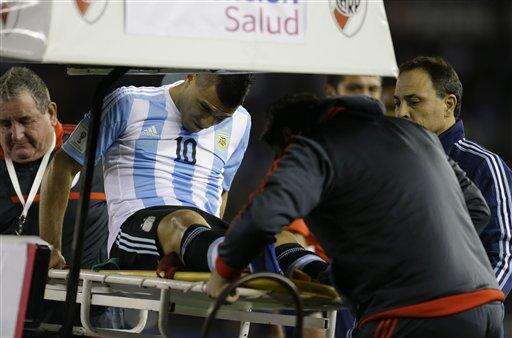 MANCHESTER, England (AP) - Manchester City striker Sergio Aguero was carried off on a stretcher, in tears, with a hamstring injury during Argentina's 2-0 loss to Ecuador in a World Cup qualifier and faces a spell on the sidelines.