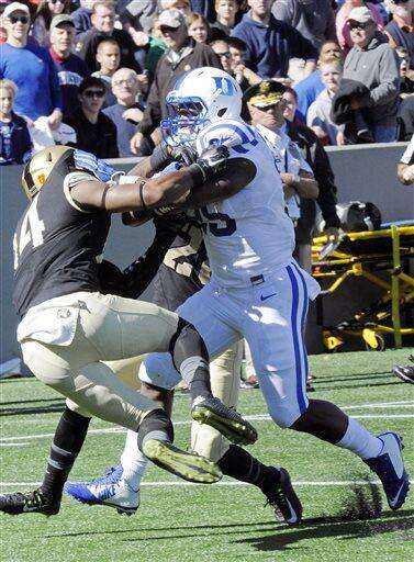 Duke running back Jela Duncan (25) runs for a touchdown while being defended by Army defensive back Chris Carnegie (14) and cornerback Brandon Jackson (28) during the first half of an NCAA college football game on Saturday, Oct. 10, 2015, in West Point, N.Y. (AP Photo/Hans Pennink)