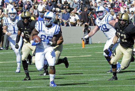 Duke running back Jela Duncan (25) runs the ball for a touchdown against against Army during the first half of an NCAA college football game on Saturday, Oct. 10, 2015, in West Point, N.Y. (AP Photo/Hans Pennink) The Associated Press