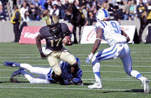 Duke running back Jela Duncan (25) runs for a touchdown while being defended by Army defensive back Chris Carnegie (14) and cornerback Brandon Jackson (28) during the first half of an NCAA college football game on Saturday, Oct. 10, 2015, in West Point, N.Y. (AP Photo/Hans Pennink) The Associated Press