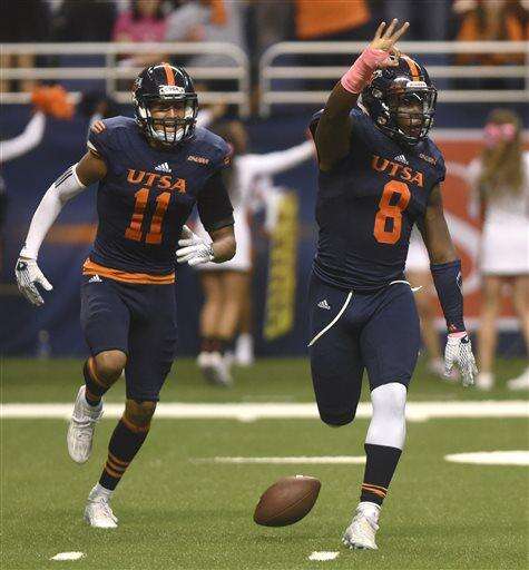 UTSA defensive back Michael Egwuagu celebrates after intercepting a first half pass against Louisiana Tech during an NCAA college football game Saturday, Oct. 10, 2015, in San Antonio. (Billy Calzada/The San Antonio Express-News via AP) RUMBO DE SAN ANTONIO OUT; NO SALES; MANDATORY CREDIT The Associated Press