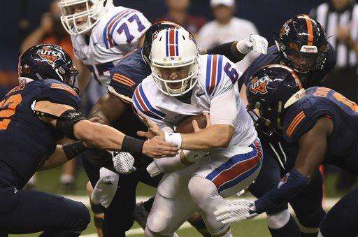 Louisiana Tech quarterback Jeff Driskel is tackled by UTSA defenders during the first half of an NCAA college football game Saturday, Oct. 10, 2015, in San Antonio. (Billy Calzada/The San Antonio Express-News via AP) RUMBO DE SAN ANTONIO OUT; NO SALES; MANDATORY CREDIT The Associated Press