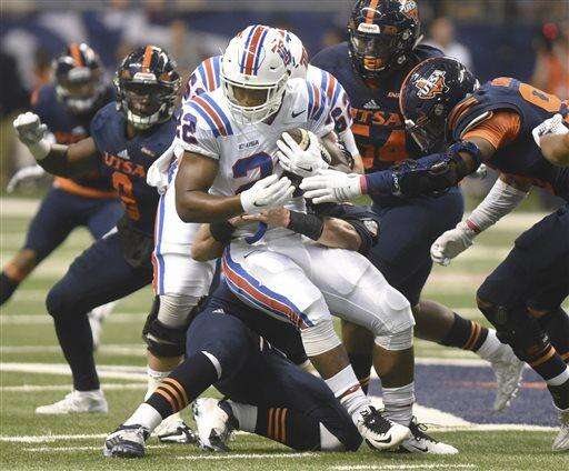 Louisiana Tech running back Jarred Craft (22) is stopped after a short gain against UTSA defenders during an NCAA college football game Saturday, Oct. 10, 2015, in San Antonio. (Billy Calzada/The San Antonio Express-News via AP) RUMBO DE SAN ANTONIO OUT; NO SALES; MANDATORY CREDIT The Associated Press