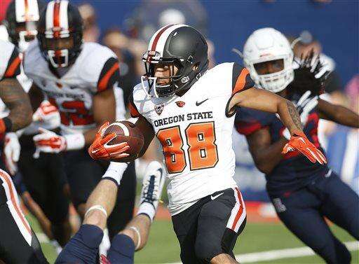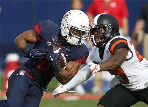 Arizona wide receiver Nate Phillips, left, runs the ball against Oregon State during the second half of an NCAA college football game, Saturday, Oct. 10, 2015, in Tucson, Ariz. (AP Photo/Rick Scuteri)