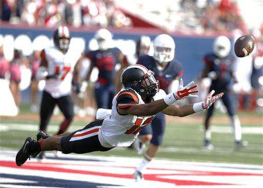Oregon State cornerback Kendall Hill dives for the football during the second half of an NCAA college football game against Arizona, Saturday, Oct. 10, 2015, in Tucson, Ariz. (AP Photo/Rick Scuteri)