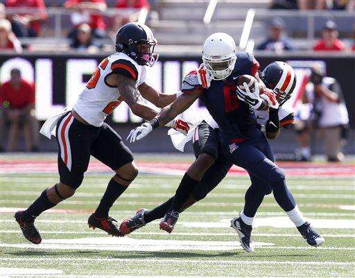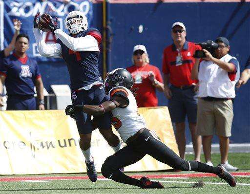 Arizona wide receiver David Richards (4) makes the catch over Oregon State cornerback Larry Scott during the first half of an NCAA college football game, Saturday, Oct. 10, 2015, in Tucson, Ariz. (AP Photo/Rick Scuteri)