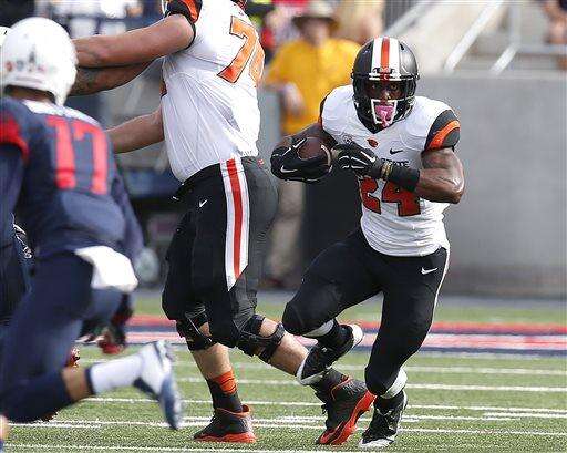 Oregon State running back Storm Woods (24) runs the ball against Arizona during the second half of an NCAA college football game, Saturday, Oct. 10, 2015, in Tucson, Ariz. (AP Photo/Rick Scuteri)