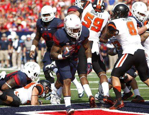 Arizona running back Orlando Bradford (21) scores a touchdown against Oregon State during the first half of an NCAA college football game, Saturday, Oct. 10, 2015, in Tucson, Ariz. (AP Photo/Rick Scuteri)