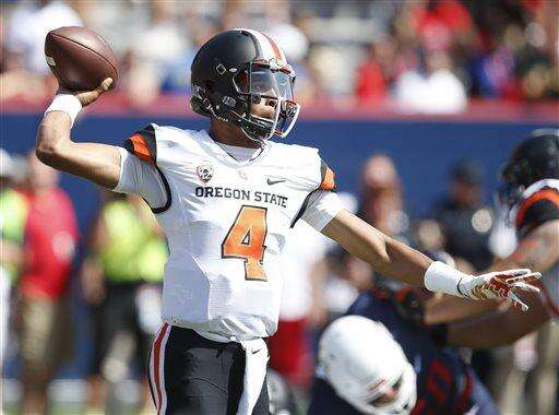 Oregon State quarterback Seth Collins throws down field against Arizona during the first half of an NCAA college football game, Saturday, Oct. 10, 2015, in Tucson, Ariz. (AP Photo/Rick Scuteri)