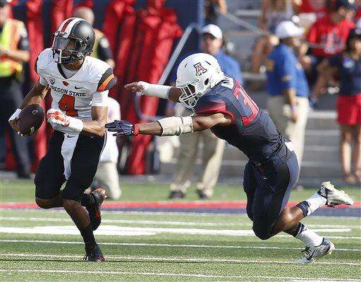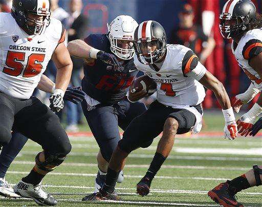 Oregon State quarterback Seth Collins (4) runs the football against Arizona during the second half of an NCAA college football game, Saturday, Oct. 10, 2015, in Tucson, Ariz. (AP Photo/Rick Scuteri)