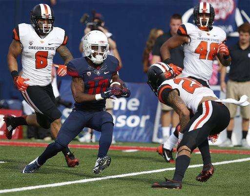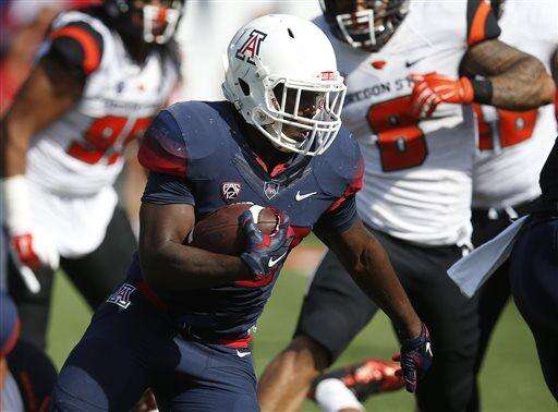 Arizona running back Nick Wilson (28) scores a touchdown against Oregon State during the first half of an NCAA college football game, Saturday, Oct. 10, 2015, in Tucson, Ariz. (AP Photo/Rick Scuteri)