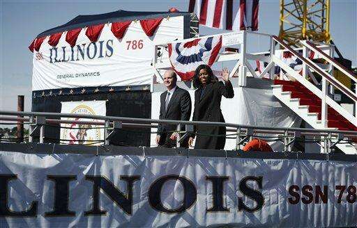 First lady Michelle Obama christens the USS Illinois with a bottle of sparkling wine as Jeffrey S. Geiger, President of General Dynamics Electric Boat, right, looks on, Saturday, Oct. 10, 2015, in Groton, Conn. The $2.7 billion vessel is the 13th in the Virginia class of submarines, which can carry out a range of missions including anti-submarine warfare, delivery of special forces, and surveillance. (AP Photo/Jessica Hill)