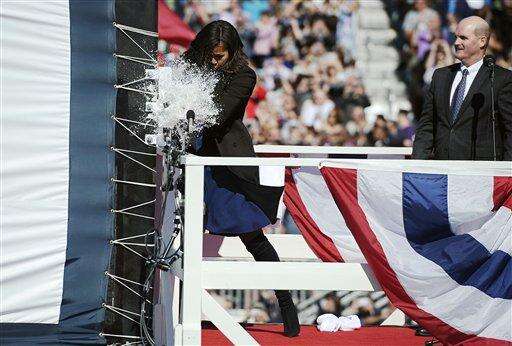 First lady Michelle Obama christens the USS Illinois with a bottle of sparkling wine at Electric Boat, a division of General Dynamics, shipyard, Saturday, Oct. 10, 2015, in Groton, Conn. The $2.7 billion vessel is the 13th in the Virginia class of submarines, which can carry out a range of missions including anti-submarine warfare, delivery of special forces, and surveillance. (AP Photo/Jessica Hill)