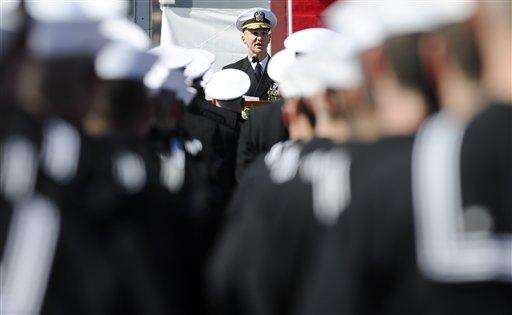 Secretary of the Navy Ray Mabus addresses the crew of the USS Illinois during a christening ceremony at Electric Boat, a division of General Dynamics, shipyard, Saturday, Oct. 10, 2015, in Groton, Conn. The $2.7 billion vessel is the 13th in the Virginia class of submarines, which can carry out a range of missions including anti-submarine warfare, delivery of special forces, and surveillance. (AP Photo/Jessica Hill)