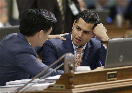 In this photo taken Friday, Sept. 4, 2015, Assemblyman Miguel Santiago, D-Los Angeles, right, talks with Assemblyman David Chiu, D-San Francisco at the Capitol in Sacramento, Calif. Gov. Jerry Brown signed into law, last July, Santiago's measure that calls on the California Community College system to add an active-shooter component to emergency response plans.(AP Photo/Rich Pedroncelli) The Associated Press