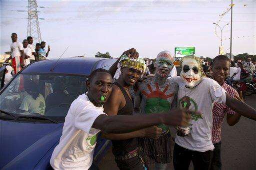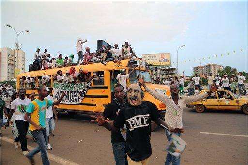 In this photo taken Wednesday, Oct. 7, 2015, supporters of UFR presidential candidate Stadia Toure ride on the back of a bus during a political rally in the city of Conakry, Guinea. Political clashes between the opposition and ruling party in Guinea are setting the stage for the countryâs second democratic election in more than half a century. The international community watches the West African country, unable to shake the deadly Ebola virus, with concern that ethnic and political tensions brought to the surface in past elections havenât declined in the past five years. (AP Photo/ Youssouf Bah)