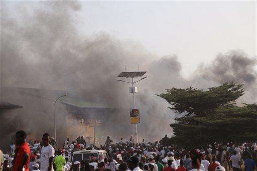 In this photo taken Thursday, Oct. 8, 2015, smoke rises from a local market during a political rally in support of UFDG presidential candidate Cellou Dalein Diallo in the city of Guinea Conakry, Guinea. Political clashes between the opposition and ruling party in Guinea are setting the stage for the countryâs second democratic election in more than half a century. The international community watches the West African country, unable to shake the deadly Ebola virus, with concern that ethnic and political tensions brought to the surface in past elections havenât declined in the past five years. (AP Photo/ Youssouf Bah)