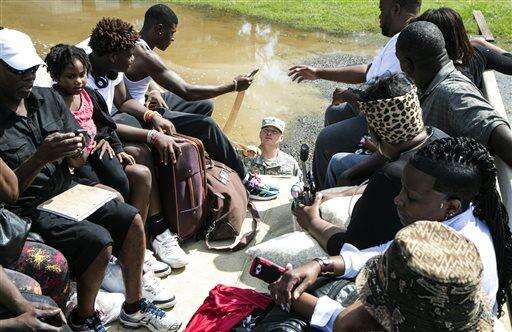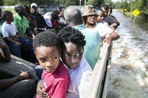 Nasir Linen, 10, holds Tristan Richards, 5, as they ride in the back of a National Guard truck as his family areis evacuated from rising flood waters in the Dunbar Community near Georgetown, S.C., Friday, Oct. 9, 2015. A week after the heavy rains first began, some South Carolina residents are still evacuating and others are stacking up sandbags for more possible flooding even as the nation's top security official prepares to inspect the damage firsthand. (Jason Lee/The Sun News via AP) The Associated Press
