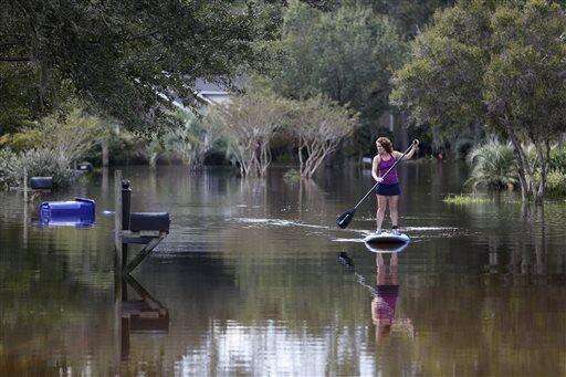 Tara Saracina rows down her street in the Ashborough subdivision of Summerville, S.C., Thursday, Oct. 8, 2015. Saracina said the floodwaters seem to be going down. "Now it's just the cleanup." (AP Photo/Mic Smith) The Associated Press
