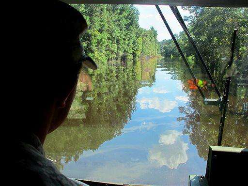 CORRECTS YEAR TO 2015 - Guardsman Michael Sanders drives a South Carolina National Guard truck down a water-covered road in Georgetown County, S.C., on Thursday, Oct. 8, 2015. The Guard was using the truck to evacuate residents as rain-swollen rivers were expected to cause more flooding in the area. (AP Photo/Bruce Smith) The Associated Press