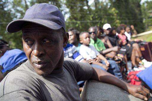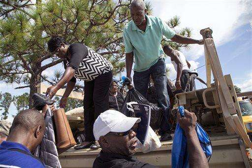 Residents of the Dunbar community hand their belongings down from a National Guard truck after evacuating their homes under threat of flooding from the Black River, Friday, Oct. 9, 2015, in Georgetown, S.C. A week after the heavy rains first began, some South Carolina residents are still evacuating and others are stacking up sandbags for more possible flooding even as the nation's top security official prepares to inspect the damage firsthand. /The Sun News via AP) The Associated Press