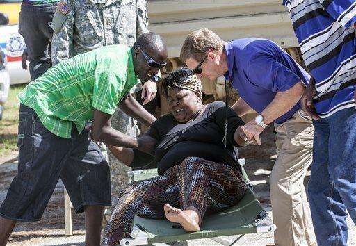 Bertha Linen gets help getting up from a cot used to lower her from the back of a National Guard truck after being evacuated from the Dunbar community of Georgetown, S.C., Friday, Oct. 9, 2015. A week after the heavy rains first began, some South Carolina residents are still evacuating and others are stacking up sandbags for more possible flooding even as the nation's top security official prepares to inspect the damage firsthand. /The Sun News via AP) The Associated Press