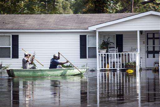 Arthur Holmes and Carnell Linen row a boat to get items from a flooded home in the Dunbar community of Georgetown, S.C., Friday, Oct. 9, 2015. A week after the heavy rains first began, some South Carolina residents are still evacuating and others are stacking up sandbags for more possible flooding even as the nation's top security official prepares to inspect the damage firsthand. (Jason Lee/The Sun News via AP) LOCAL PRINT OUT (MYRTLE BEACH HERALD OUT, HORRY INDEPENDENT OUT, CAROLINA FOREST CHRONICLE, GEORGETOWN TIMES OUT); MANDATORY CREDIT The Associated Press