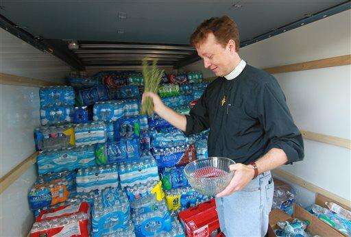 Father Jack Hardaway of Grace Episcopal Church blesses water delivered from The Holy Innocents' Episcopal School in Atlanta to help flood victims in Anderson, S.C., on Thursday, Oct. 8, 2015. A number of South Carolina residents near the coast are evacuating and others are piling up sandbags anew outside homes and businesses, bracing for more possible flooding even as the nation's Homeland Security chief is set later Friday to tour areas hit hard by recent heavy rains. (Ken Ruinard/The Independent-Mail via AP) THE GREENVILLE NEWS OUT, SENECA NEWS OUT; MANDATORY CREDIT The Associated Press