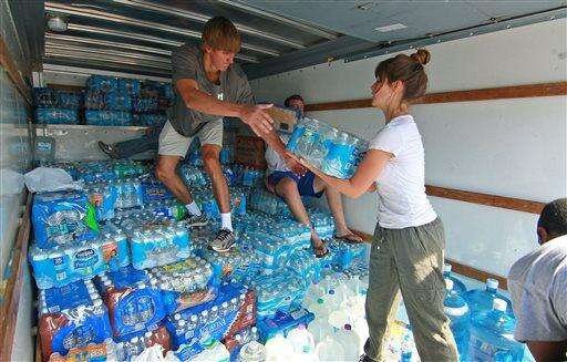 Preston Hester, left, and Johnna Godomski help unload water at Grace Episcopal Church to help flood victims in Anderson, S.C., on Thursday, Oct. 8, 2015. A number of South Carolina residents near the coast are evacuating and others are piling up sandbags anew outside homes and businesses, bracing for more possible flooding even as the nation's Homeland Security chief is set later Friday to tour areas hit hard by recent heavy rains. (Ken Ruinard/The Independent-Mail via AP) THE GREENVILLE NEWS OUT, SENECA NEWS OUT; MANDATORY CREDIT The Associated Press