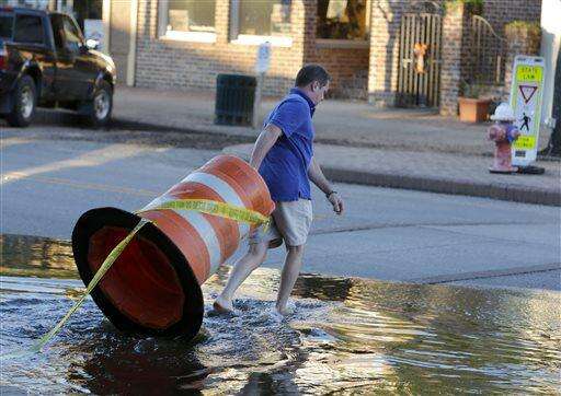 Harris Carter, owner of Castaways & Grill in the historic section of Georgetown, moves a road barrier to block traffic as high tide approaches historic downtown Georgetown, S.C., Thursday, Oct. 8, 2015. Gov. Nikki Haley held a press conference Thursday, telling Georgetown residents to prepare for floodwaters. Many store owners in the historic district have prepared for repeated flooding over the course of a week. (AP Photo/Mic Smith) The Associated Press