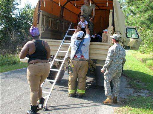 A Georgetown County firefighter helps a child into a South Carolina National Guard truck in Georgetown County, S.C., on Thursday, Oct. 8, 2015. The family was being evacuated as rain-swollen rivers are expected to cause more flooding in the area. (AP Photo/Bruce Smith) The Associated Press