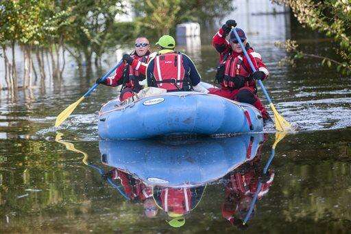 Firefighters evacuate Eliza Linen by boat from her home in the Dunbar Community of Georgetown, S.C., Friday, Oct. 9, 2015. A week after the heavy rains first began, some South Carolina residents are still evacuating and others are stacking up sandbags for more possible flooding even as the nation's top security official prepares to inspect the damage firsthand. (Jason Lee/The Sun News via AP) The Associated Press