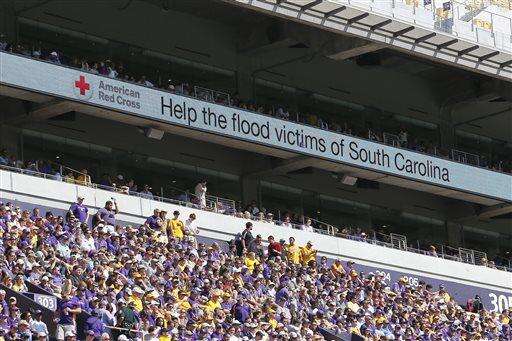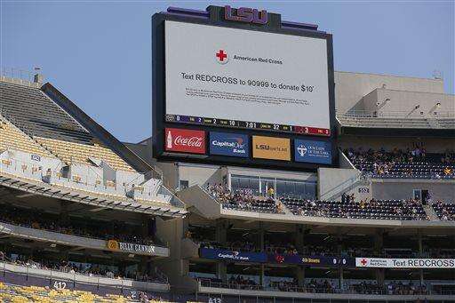 A message from the American Red Cross is displayed on a screen during the first half of an NCAA college football game between LSU and South Carolina in Baton Rouge, La., Saturday, Oct. 10, 2015. The game was moved from Columbia, S.C. to Baton Rouge because of flooding. (AP Photo/Jonathan Bachman) The Associated Press