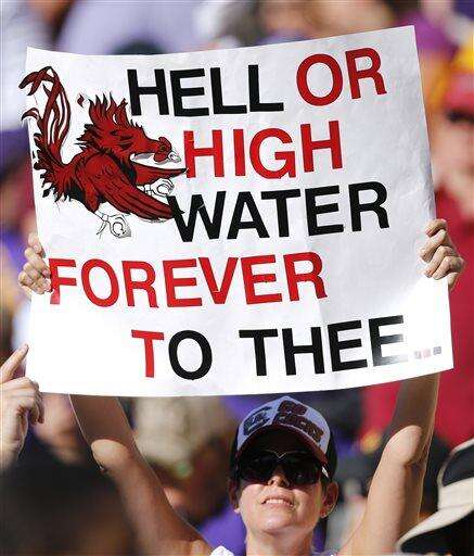 Fans hold a signs in support of South Carolina during the first half of an NCAA college football game between LSU and South Carolina in Baton Rouge, La., Saturday, Oct. 10, 2015. The game was moved from Columbia, S.C. to Baton Rouge because of flooding. (AP Photo/Jonathan Bachman) The Associated Press