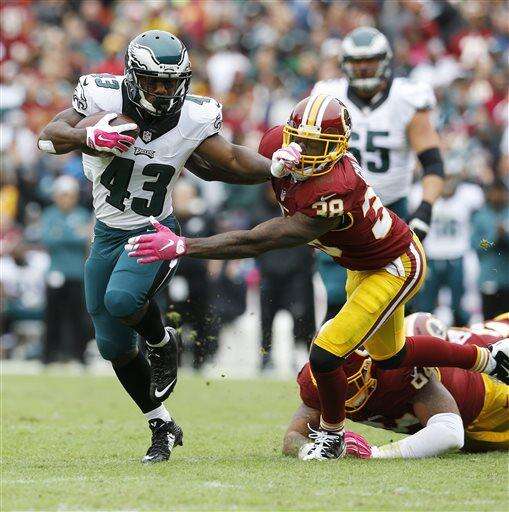 Philadelphia Eagles running back Darren Sproles (43) tries to elude Washington Redskins free safety Dashon Goldson (38) during the first half of an NFL football game in Landover, Md., Sunday, Oct. 4, 2015. (AP Photo/Patrick Semansky) The Associated Press