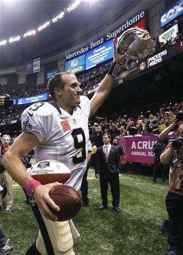 New Orleans Saints quarterback Drew Brees (9) greets the crowd as he goes off the field after their overtime win in an NFL football game against the Dallas Cowboys in New Orleans, Sunday, Oct. 4, 2015. (AP Photo/Jonathan Bachman) The Associated Press