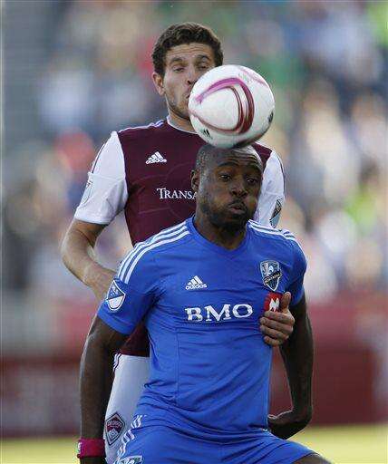 Montreal Impact's Nigel Reo-Coker, front, heads the ball in front of Colorado Rapids' Dillon Powers during the first half of an MLS soccer match in Commerce City, Colo., Saturday, Oct. 10, 2015. (AP Photo/David Zalubowski) The Associated Press